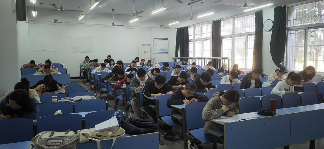 考试期间,同学们有序就坐,在严肃的考场秩序中仔细答题、认真检查。监考人员维护考场纪律,考场秩序井然。