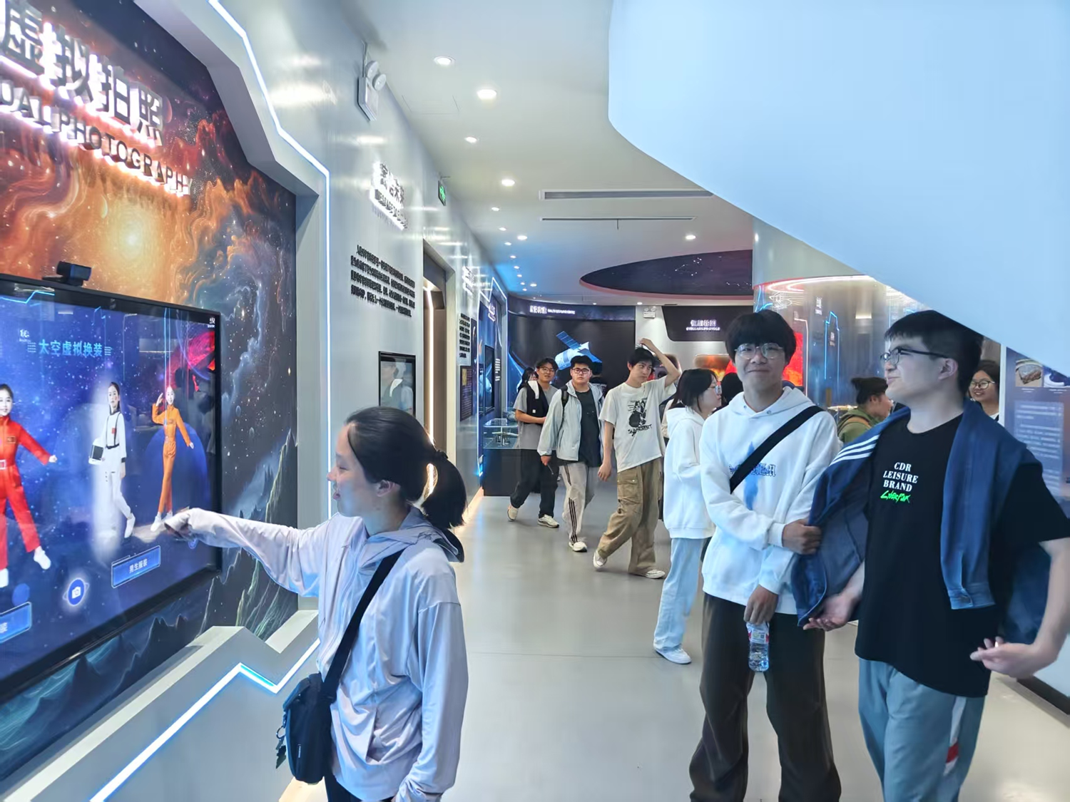 本次活动的主题是“弘扬稼先精神·探索宇宙奥秘”。在天文展厅,同学们全景式了解星体运行规律与航天科技前沿,“穿上航天服”拍一张“航天员”照,体验航天员的自豪感;在气象展厅,同学们模拟水力发电,交互式体验气象监测设备与灾害预警系统,开展互动答题,挑战气象知识竞赛;在天文观测台,同学们零距离操作专业望远镜,交流望远镜工作原理,观测太阳黑子活动,学习太阳黑子形成的原理。