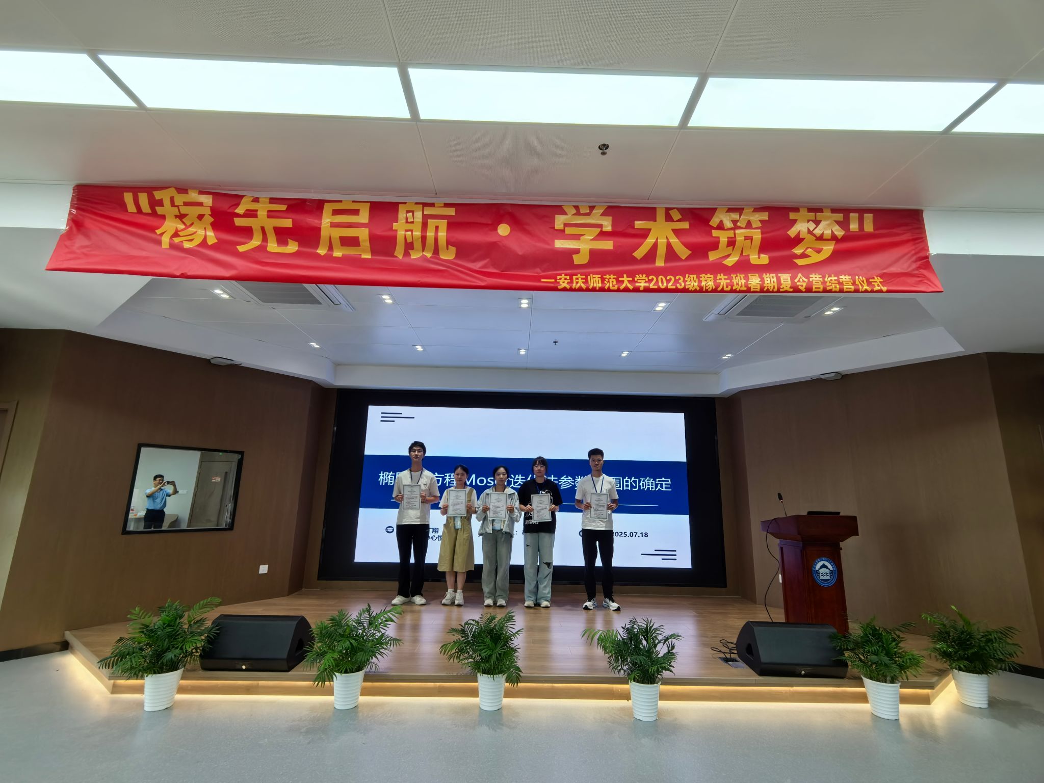 为确保夏令营活动的安全与质量,安庆师范大学与东南大学项目组形成“双保险”管理,他们做了大量幕后工作。安庆师范大学和教务处给予了极大的政策和经费支持;安庆师范大学基建与后勤管理处贴心地安排了校车到安庆高铁站接送参加夏令营的同学;数理学院领导班子高度重视邓稼先班人才培养,全力支持开展夏令营活动,前期做了大量的调研;易明芳、彭芳珍、杨吉星带队全程驻守;东南大学项目组精心安排了员工的食、宿、行,科学设计了项目课题、学术报告、学业指导等各个环节,并安排了临时辅导员管理营员生活、项目推进等。正是在各方面一起努力的前提下,本期夏令营取得圆满成功,正如夏令营主题“启航·筑梦”所期许的,这颗播撒在东大沃土上的种子,或将在未来长成支撑基础学科发展的栋梁。如23级数学邓稼先班潘轶泽同学所说:“在这个蝉鸣悠长,阳光炽热的暑假,为期七天的研学之旅教会我的不仅是知识的获取,更是心灵的蜕变和思想的升华。这段时间我掌握了Matlab和Latex的编译,增强了自主思考,合作交流的意识,培养了动手操作,实践模拟的能力,体悟到知识来源于书本,根植于脚踏实地的探索。带着这份经历与感悟,我将这段时光化作成长的养分,在属于我的星辰大海中,绽放独一无二的绚丽光芒!”(撰稿\摄影:杨吉星、孙野、崔妮,柳智超等;审核:易明芳)