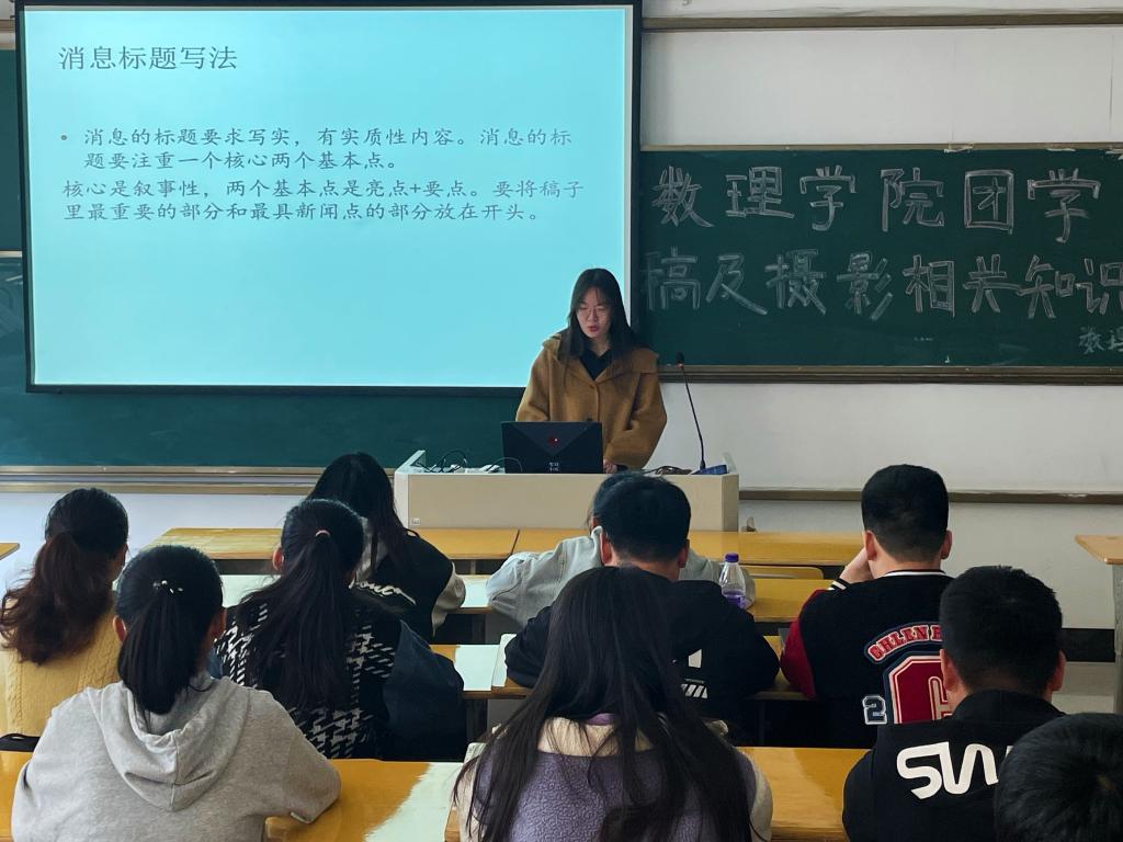 为提高数理学院团学干部的摄影水平及新闻稿写作能力,4月17日,数理学院在I楼204教室举办新闻稿写作和摄影培训会。本次培训会邀请校记者团成员担任主讲嘉宾,学院团学干部参与会议。
