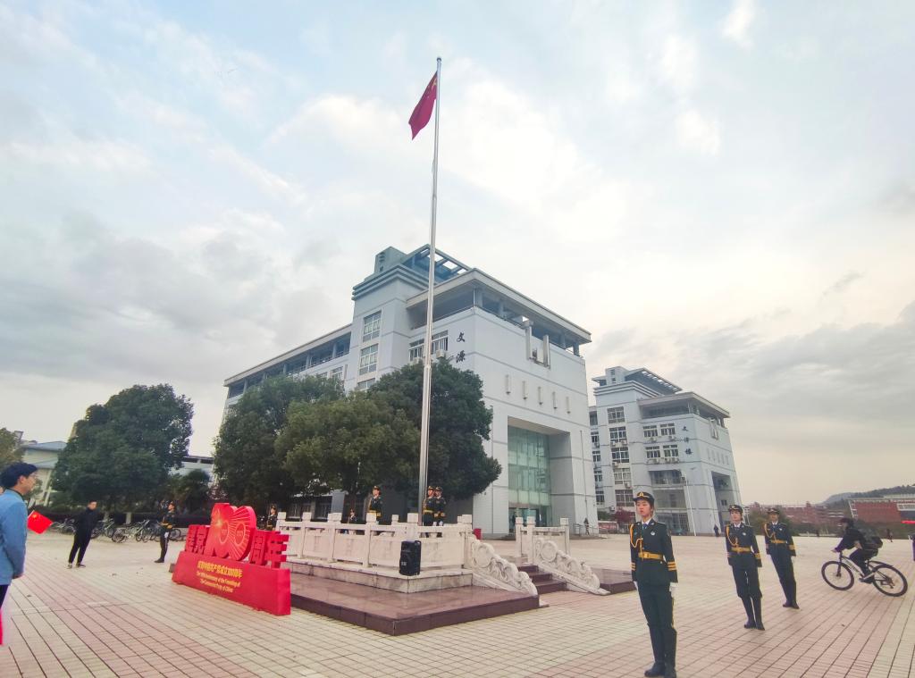 仪式开始前,活动负责人黄兴强给每位同学分发了小红旗。参加升旗仪式的同学们挥舞手中的红旗注视着国旗台,英姿飒爽的国旗护卫队迈着整齐一致的步伐,护送鲜艳的五星红旗向国旗台走来。