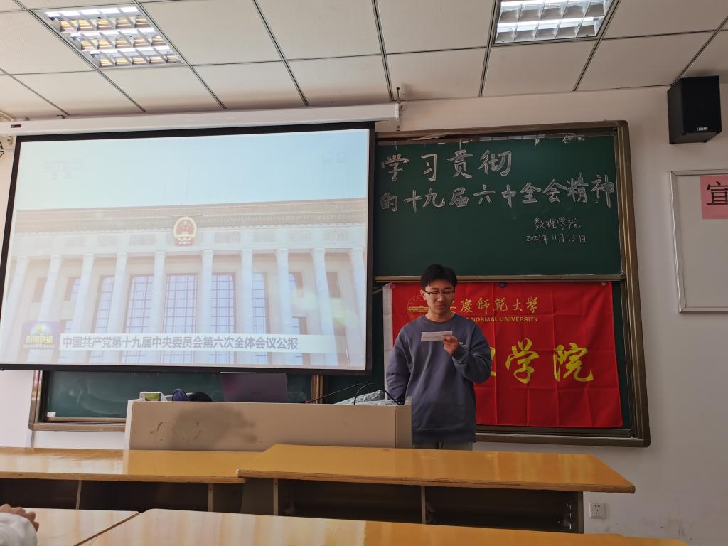 会议过程中,青年学子观看第十九届六中全会新闻联播视频,并做出了自己的思考。谭旗泉同学认为:党的十九届六中全会胜利召开,全面总结了党的百年奋斗历程重大成就和历史经验,进一步明晰了实现中华民族伟大复兴奋进路径。周新元同学在此次学习后也表示“我们也应该响应国家号召,践行十九届六中全会的精神,争做新时代好青年。”