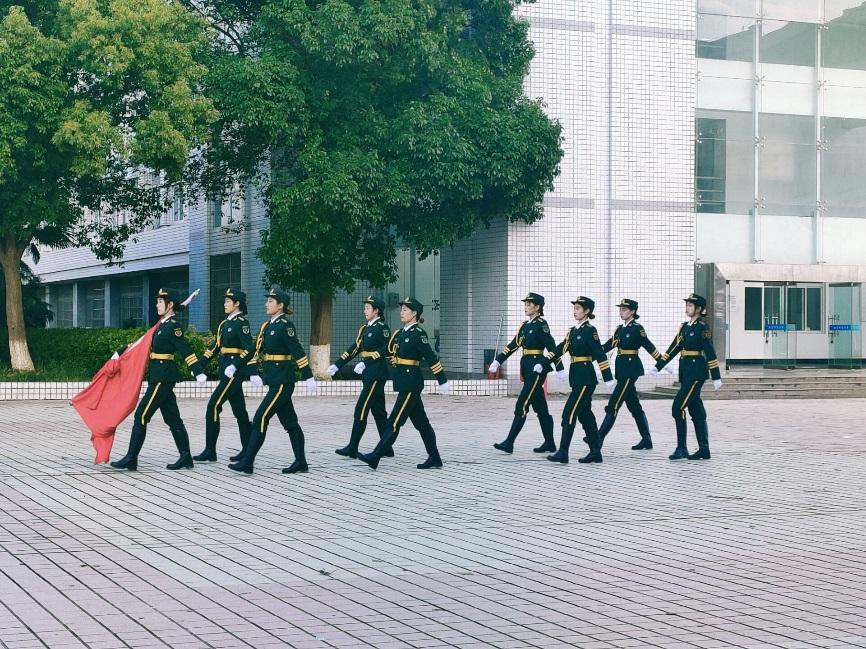 在全体师生注目礼下,英姿飒爽的国旗护卫队队员们护送鲜艳的五星红旗向国旗台走来。