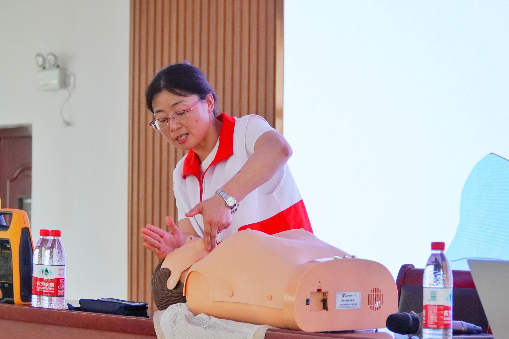 本次培训分为急救知识理论学习和实训操作两个部分。“患者发生休克或心脏骤停后,我们要了解正确的救援位置,掌握有效的救援方法,在事发现场对患者进行心肺复苏。”安庆市红十字会应急救护指导老师华蓉结合近年来发生的典型案例,围绕紧急呼救、心肺复苏和其他突发事件处理方法的内容,讲解了急救知识和基本救护原则。她通过幻灯片展示的形式,细致分析了选择心肺复苏进行急救的优势,并梳理了心肺复苏的体位调整、气道开放、呼吸判断和人工呼吸的施行措施。