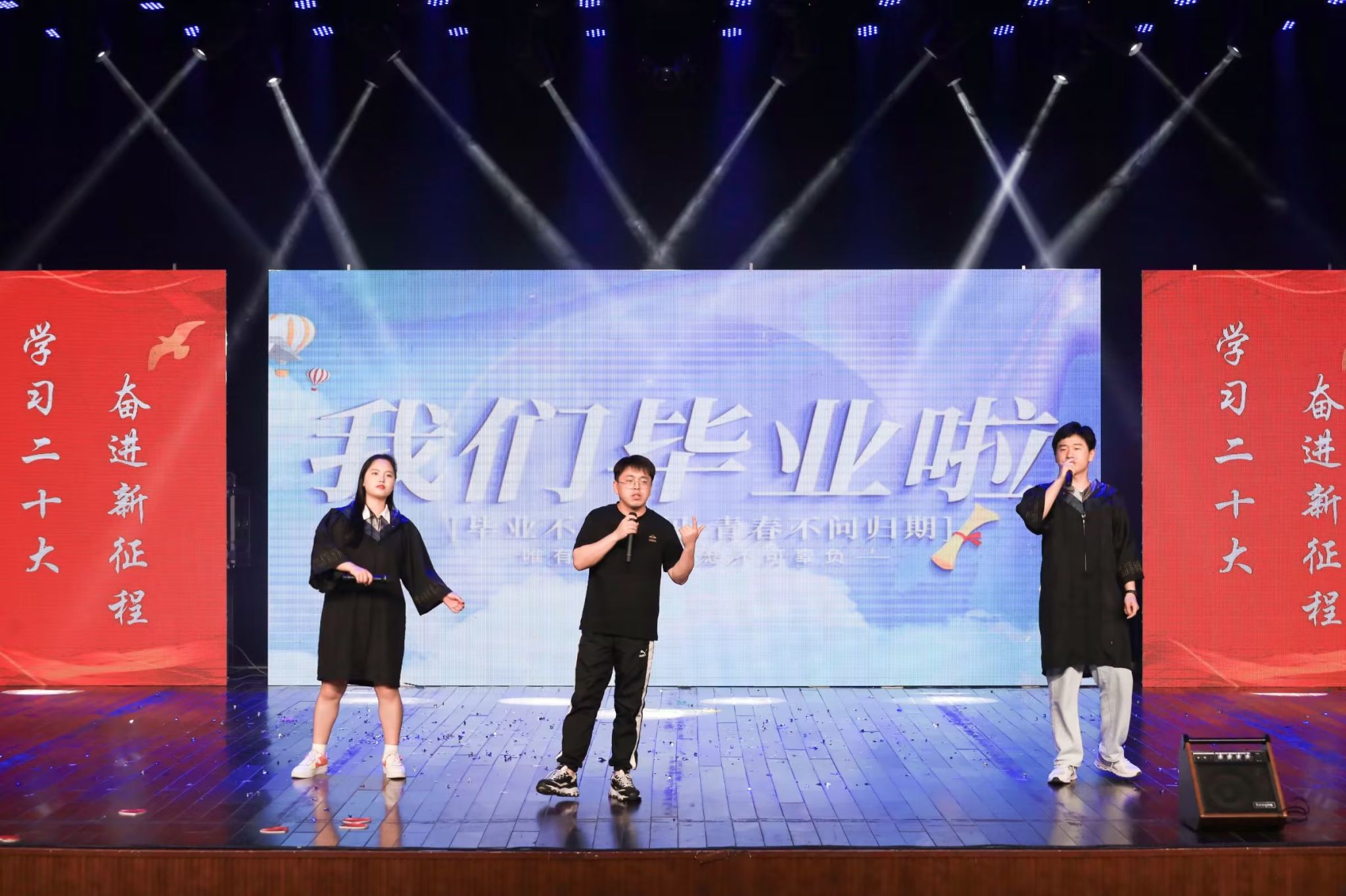 由团学负责老师黄兴强带来的抒情歌曲《忘记时间》节奏舒缓,旋律独特,字词间处处充满回忆,又句句蕴含哲理。“很欣慰生命某段时刻,曾一起度过。”……伴随着台下热烈的掌声,毕业班辅导员汪健和数学与应用数学专业2019(4)班的车明路、陈杭合唱毕业歌曲《凤凰花开的路口》,向他们共同度过的大学时光挥手告别。车明路坦言,为了筹备此次节目,他们排练了近半个月的时间,想在临走前与老师一起参与表演,留下美好的大学回忆。“直到现在,我才感受到自己是真正地毕业了,希望学弟学妹们能够珍惜现在的时光,不负青春,不负未来!”车明路说。