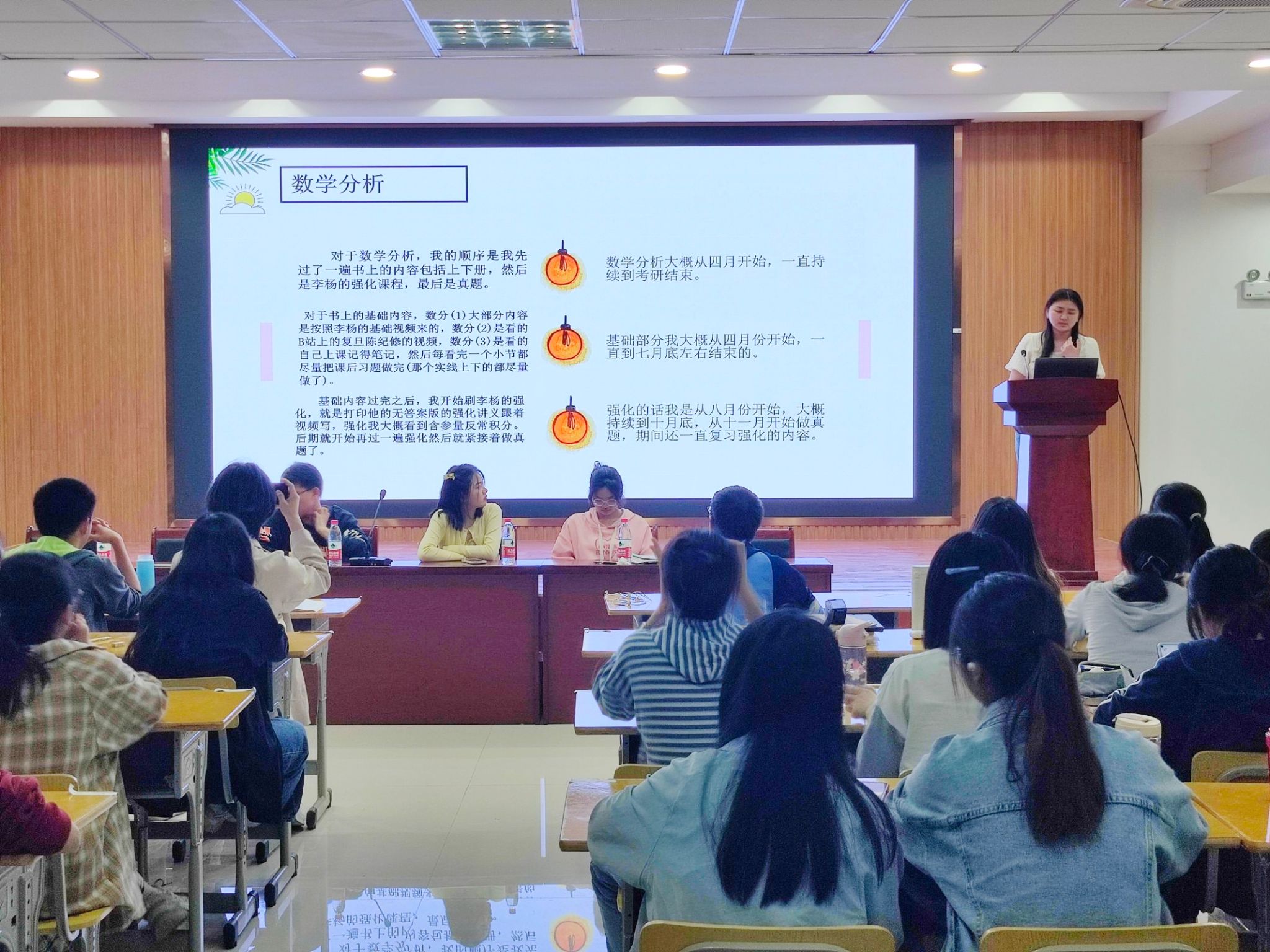 分享会上,考取华南师范大学的李若楠从考研择校、考研科目复习以及考研博主分享三个方面分享自己的考研经验,她认为找到一个好的考研博主可以让考研事半功倍;考取扬州大学的朱庆环结合数学专业学科特色、考研资料选择、考研时间规划等,分享了自己的考研心路历程。“当我收到学院老师的邀请来进行考研经验分享交流时,我感到无比的激动与自豪,我希望能够将自己在考研时的经验和心得体会毫无保留的分享给学弟学妹们,帮助他们尽早确定考研院校,科学规划考研复习计划,少走弯路。”数学与应用数学专业2019级邓稼先班的高亚林表示,自己去年考研时也得到了学长学姐们的帮助,希望这次也能够奉献自己的绵薄之力。