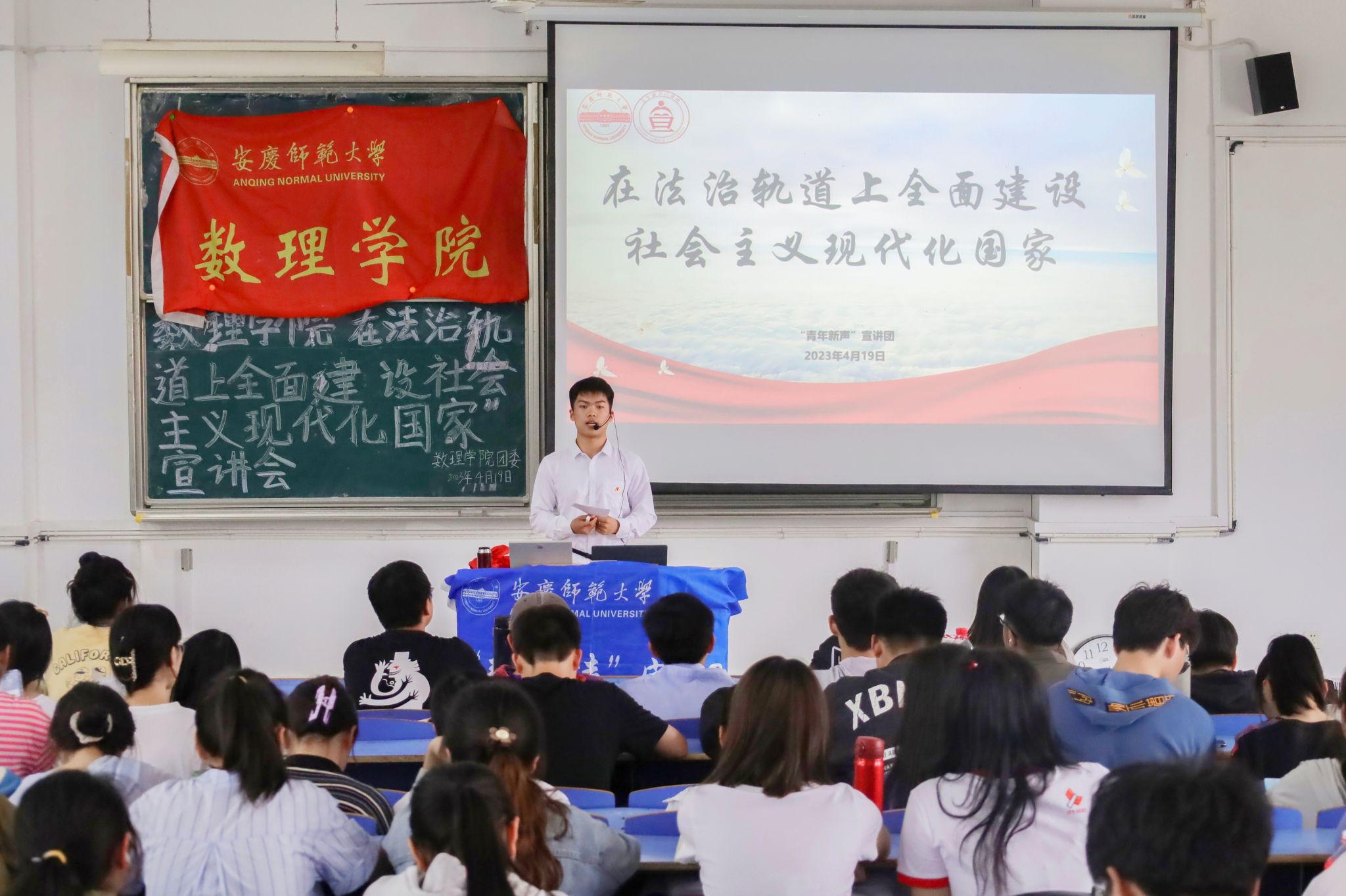 4月19日,校“青年新声”宣讲团在C208教室以“在法治轨道上全面建设社会主义现代化国家”为主题,面向数理学院青马班学员、入党积极分子、入团积极分子等开展宣讲活动,学习贯彻党的二十大报告精神,普及法治知识。