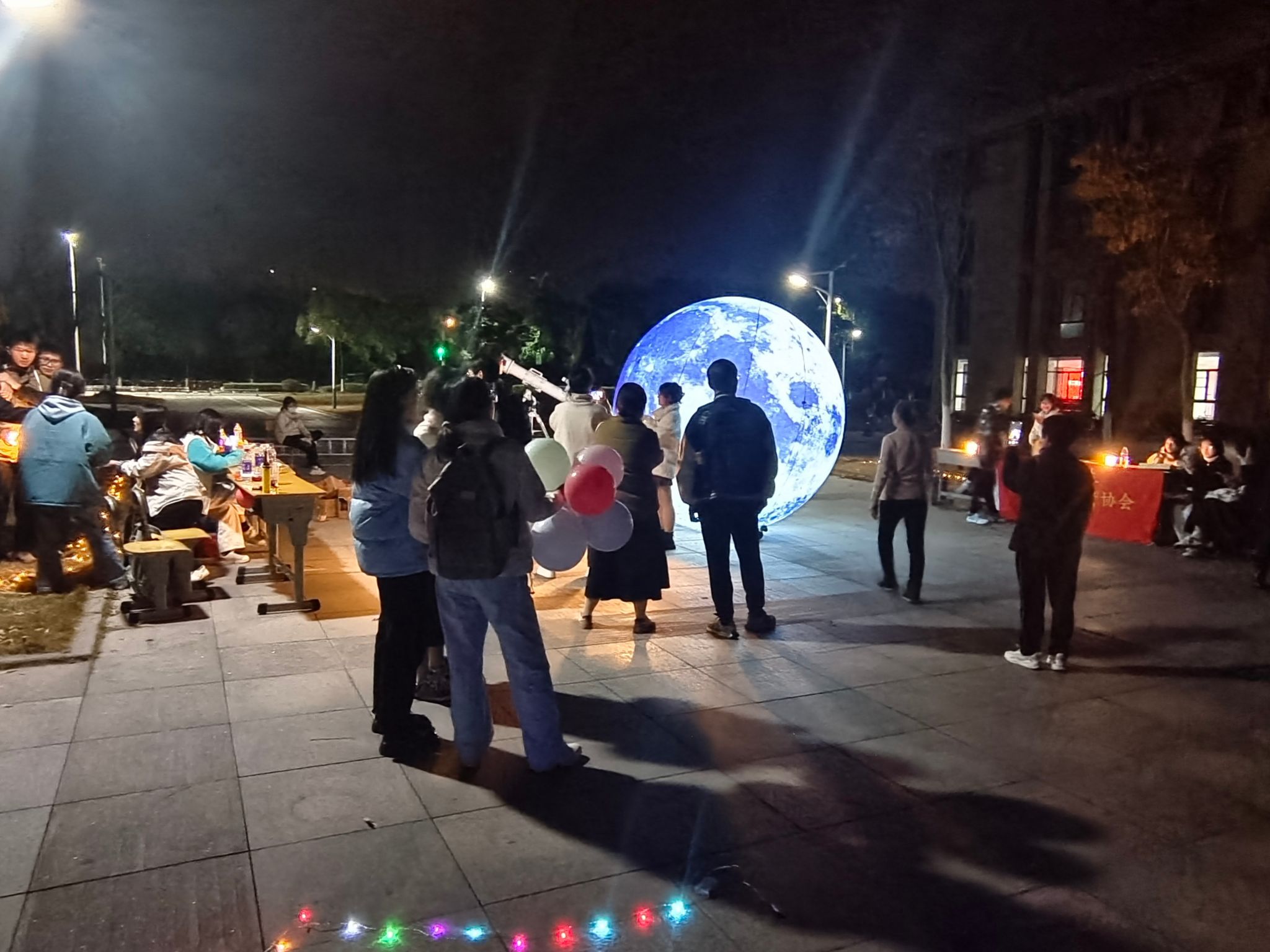 活动当天,天文协会就开始进行活动场地的布置:搭建天文望远镜、布置霓虹灯带等。傍晚六点时分,在落日余晖中,同学们陆续来到活动现场,兴奋地观测木星土星,并参加十二星座图案问答等小游戏,聆听木星土星相关科普知识,现场不少同学还和望远镜合影留念。