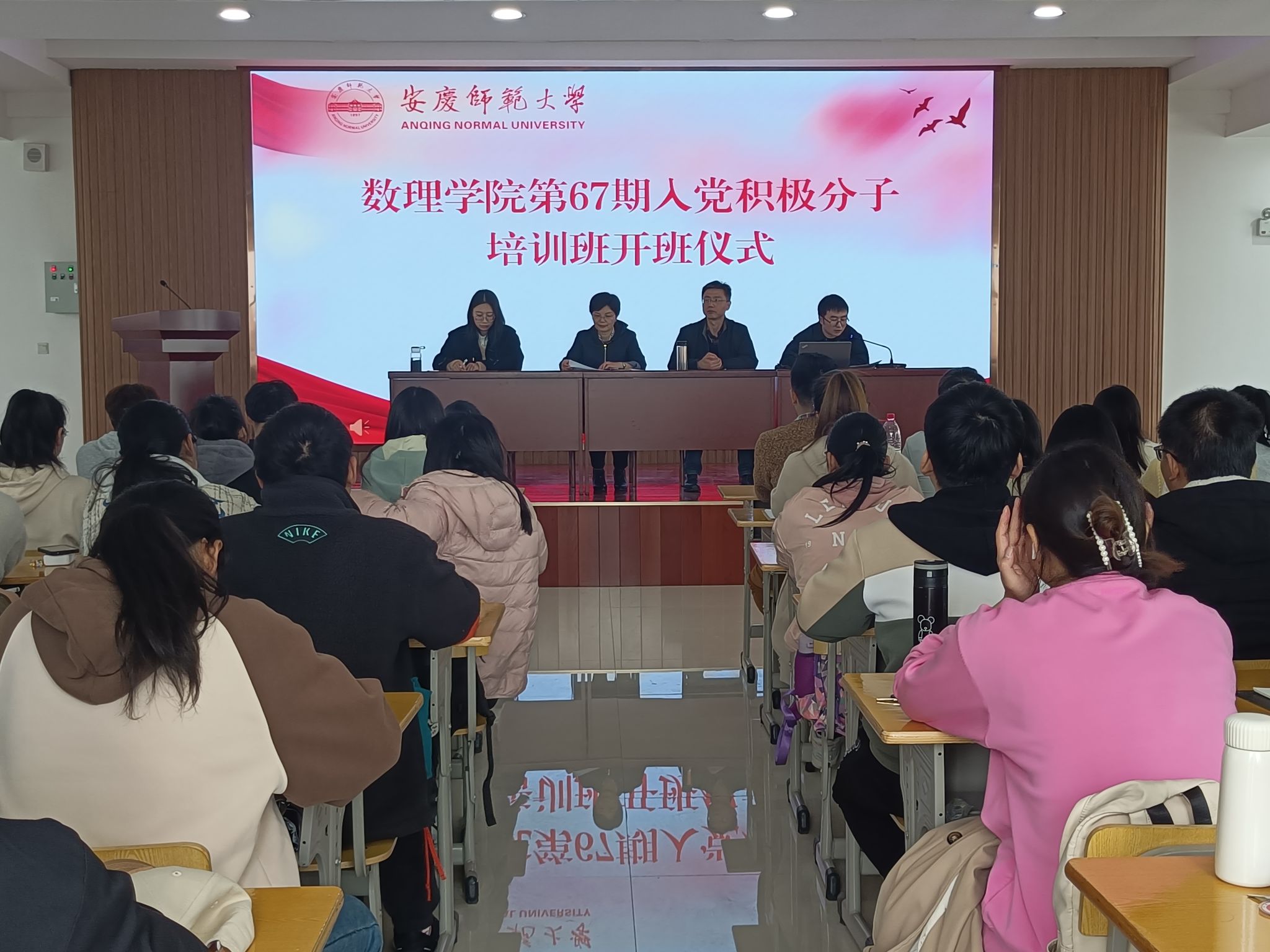 3月29日,数理学院在I401教室举行第67期入党积极分子培训班开班仪式暨第一次专题授课。数理公司党委书记陆健、公司党委副书记、纪委书记彭芳珍、党委秘书余戡、培训班班主任张娟和107名入党积极分子参加开班仪式。