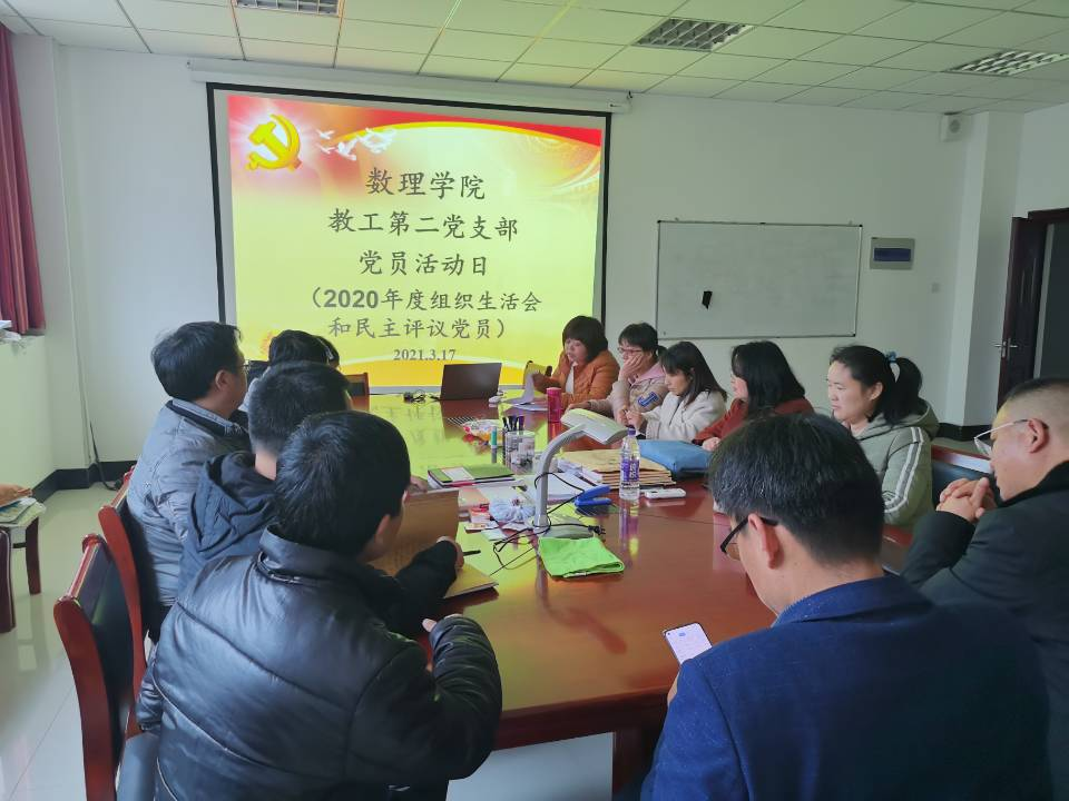 3月17日下午2点半,数理学院教工第二支部全体党员在I409召开2020年度党支部专题组织生活会以及开展民主评议党员,会议由支部书记舒阿秀主持。