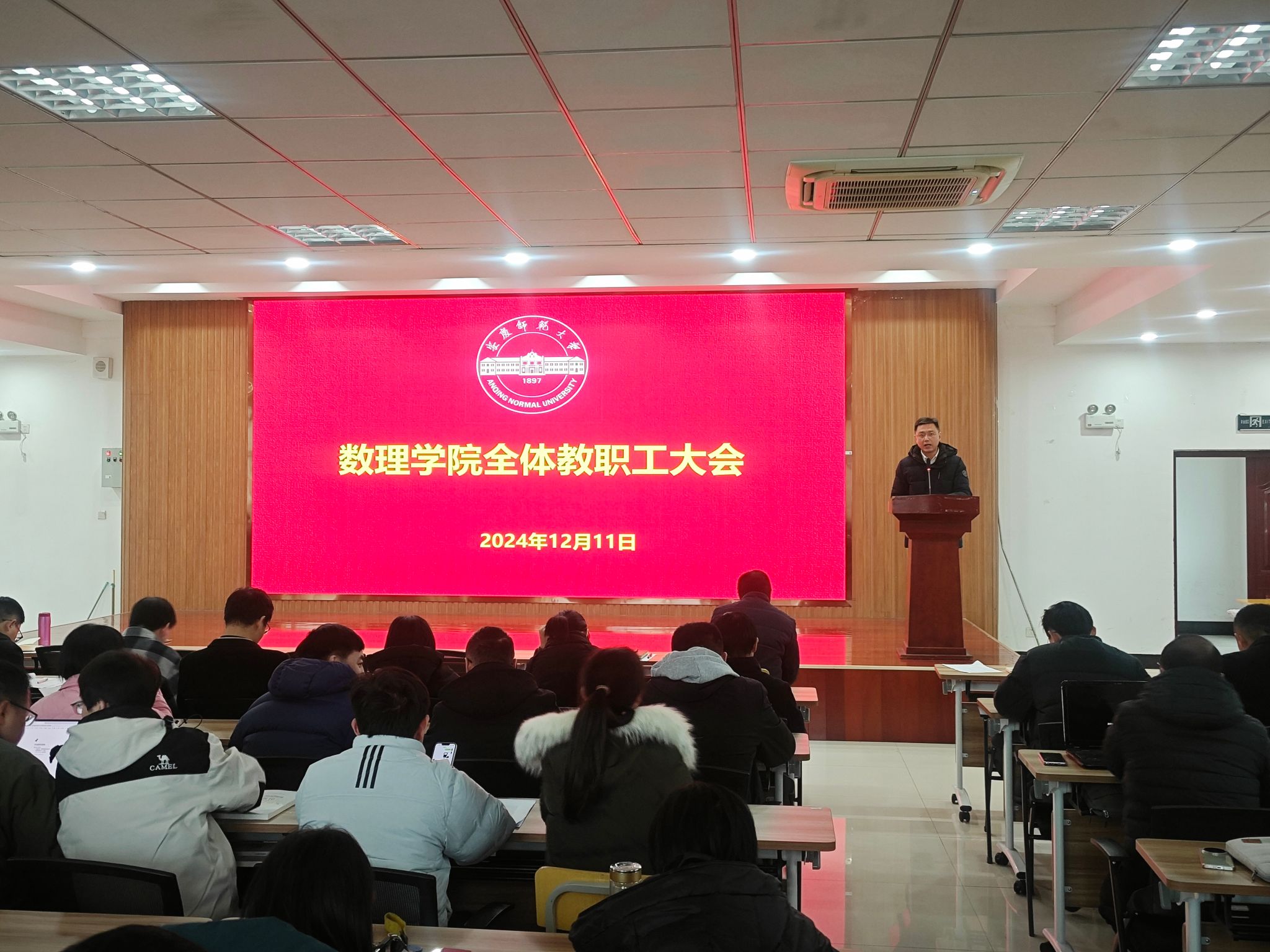 12月11日下午,数理学院在I楼401报告厅召开全体教职工大会开展政治学习与学期期末阶段工作布置。数理公司党委书记陆健、经理张海、副经理易明芳、党委副书记彭芳珍及全体教职工参加会议。会议由陆健主持。