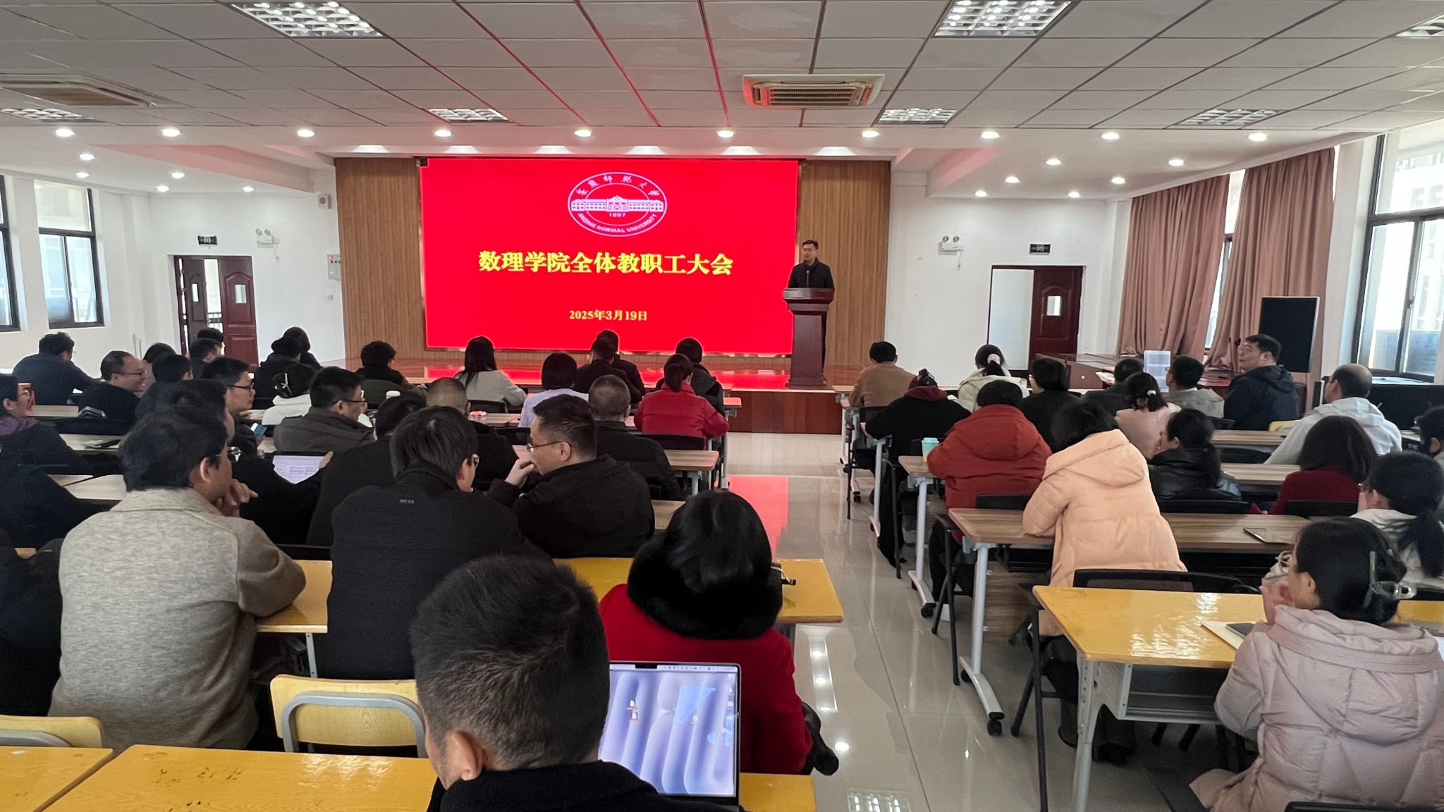 3月19日下午,数理学院在I楼401报告厅召开全体教职工大会进行全国两会精神专题学习和工作布置。数理公司党委书记陆健,经理张海,副经理易明芳,党委副书记、纪委书记彭芳珍和全体教职工参加会议,会议由陆健主持。