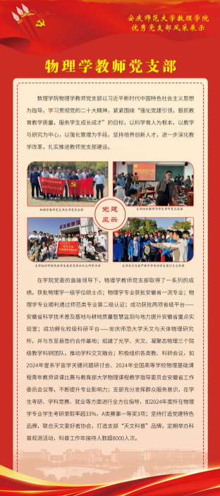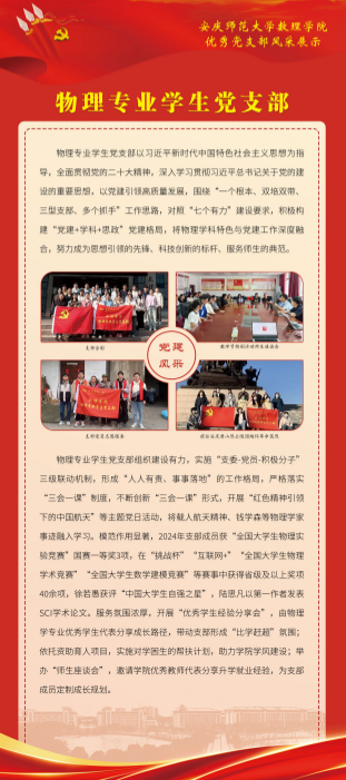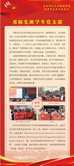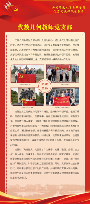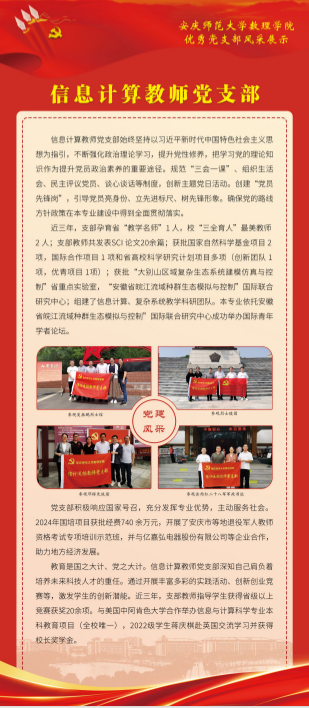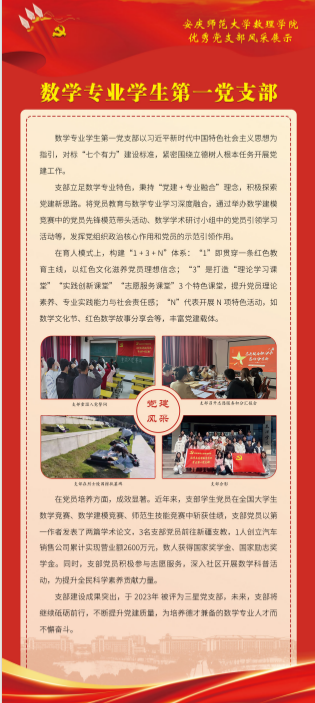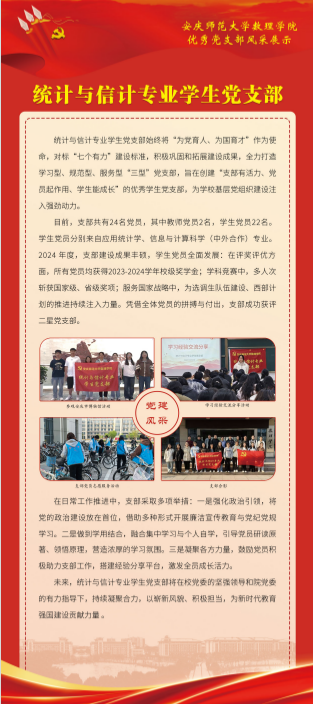 2024年,数理公司党委坚持把提高党支部建设质量作为固本之举,长远之计,持续推进党支部标准化规范化建设,切实增强党支部政治功能和组织功能,以星级党支部建设和党建“双创”工作为抓手,探索出一条“强基础、提质量、创品牌”的实践新路径。数理学院基层党建工作取得新进展新成效,涌现出一批政治功能强、支部班子强、党员队伍强、作用发挥强的优秀党支部。为总结推广优秀党支部建设经验做法,开设“优秀党支部风采展”专栏,深入宣传基层党支部在创建过程中的思路举措,充分展现党建服务学院高质量发展取得的实实在在成果,充分发挥基层党支部战斗堡垒和党员先锋模范作用。(编辑:余戡等;审核:陆健)