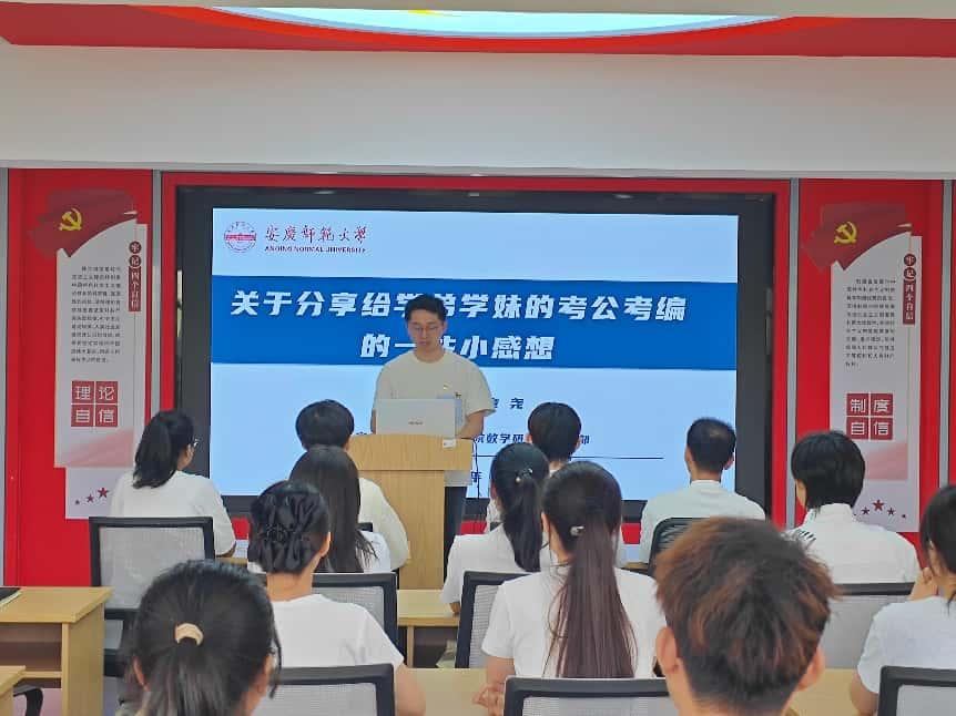 会上,支部优秀党员张子蝶和章尧两位同志“传经送宝”,分别介绍了他们升学和就业的备考策略,从公务员考试的“岗位选择、笔试技巧、面试心态”到博士招考的“学术积淀、科研规划、院校适配”,全方位分享升学和就业路径。