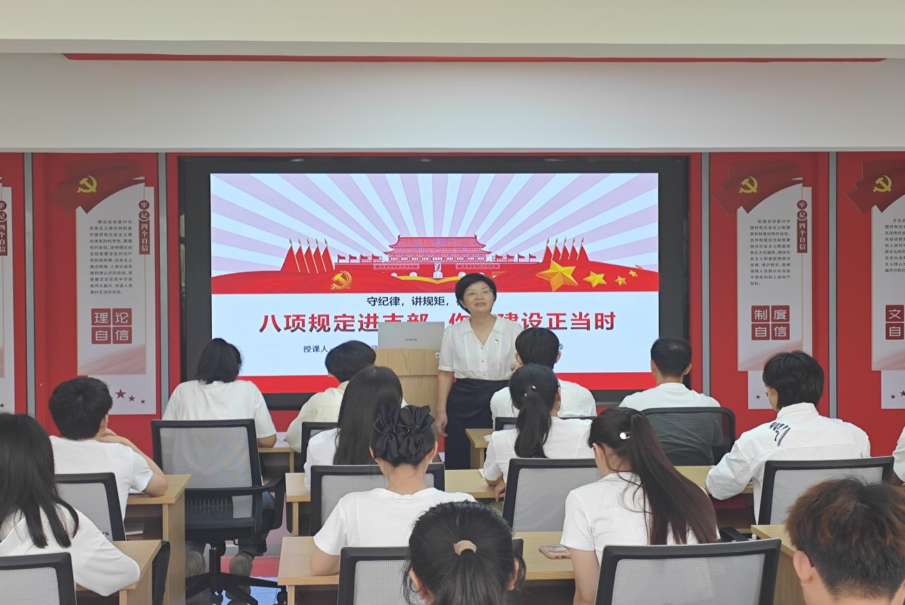数理公司党委副书记彭芳珍以“八项规定进支部 作风建设正当时”为主题为同学们讲授专题党课。她围绕中央八项规定具体内容,深入浅出地阐释了纪律规矩的内涵与实践要求,作风建设的重要性;讲解违反中央八项规定精神的主要表现,以真实案例敲响警钟。她指出,员工党员作风建设是筑牢理想信念根基、发挥先锋模范作用、引领校园清风正气、培育新时代德才兼备人才的根本保障。新时代的员工党员一定要强化责任与担当,带头“守纪律、讲规矩、树新风”。