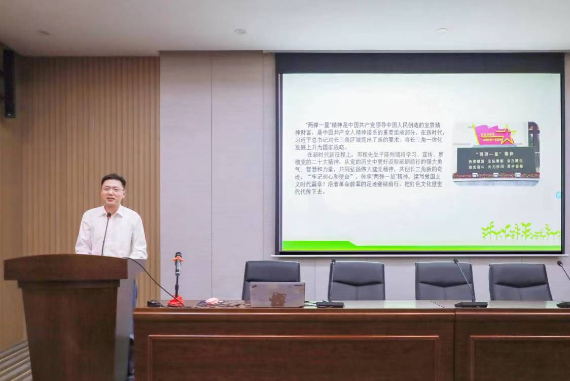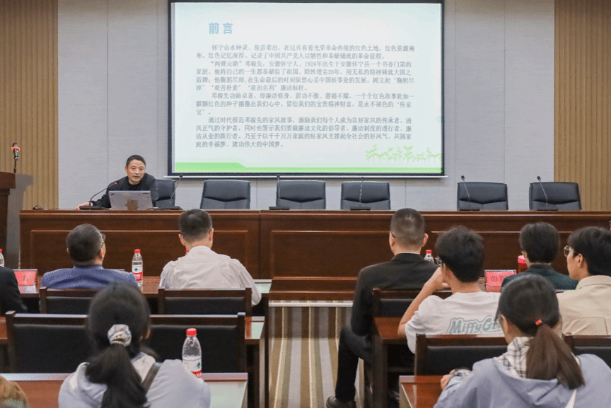 仪式上,怀宁县文物保护中心、博物馆陈列保管部主任潘启和应邀为员工作题为“文脉传家 松风水月——“两弹元勋”邓稼先的家风家教”的专题讲座。他生动呈现了邓氏家族“胸有方心,身无媚骨”的志气,深刻阐释了“三不朽”即“立不朽之德,立不朽之言,立不朽之功”家训的内涵,特别是他在讲述“邓稼先用一生践行一个诺言,挺起国家脊梁”的事迹,深深感动了在场的每一个人。潘启和指出,良好家风是个人成长的营养剂,激励着青年人怀揣建设家乡的理想,继承和发扬科学精神与优良作风,为新时代中国特色社会主义建设助力添彩。