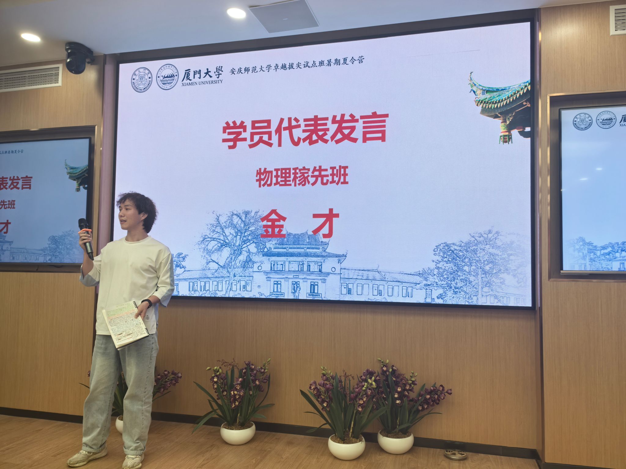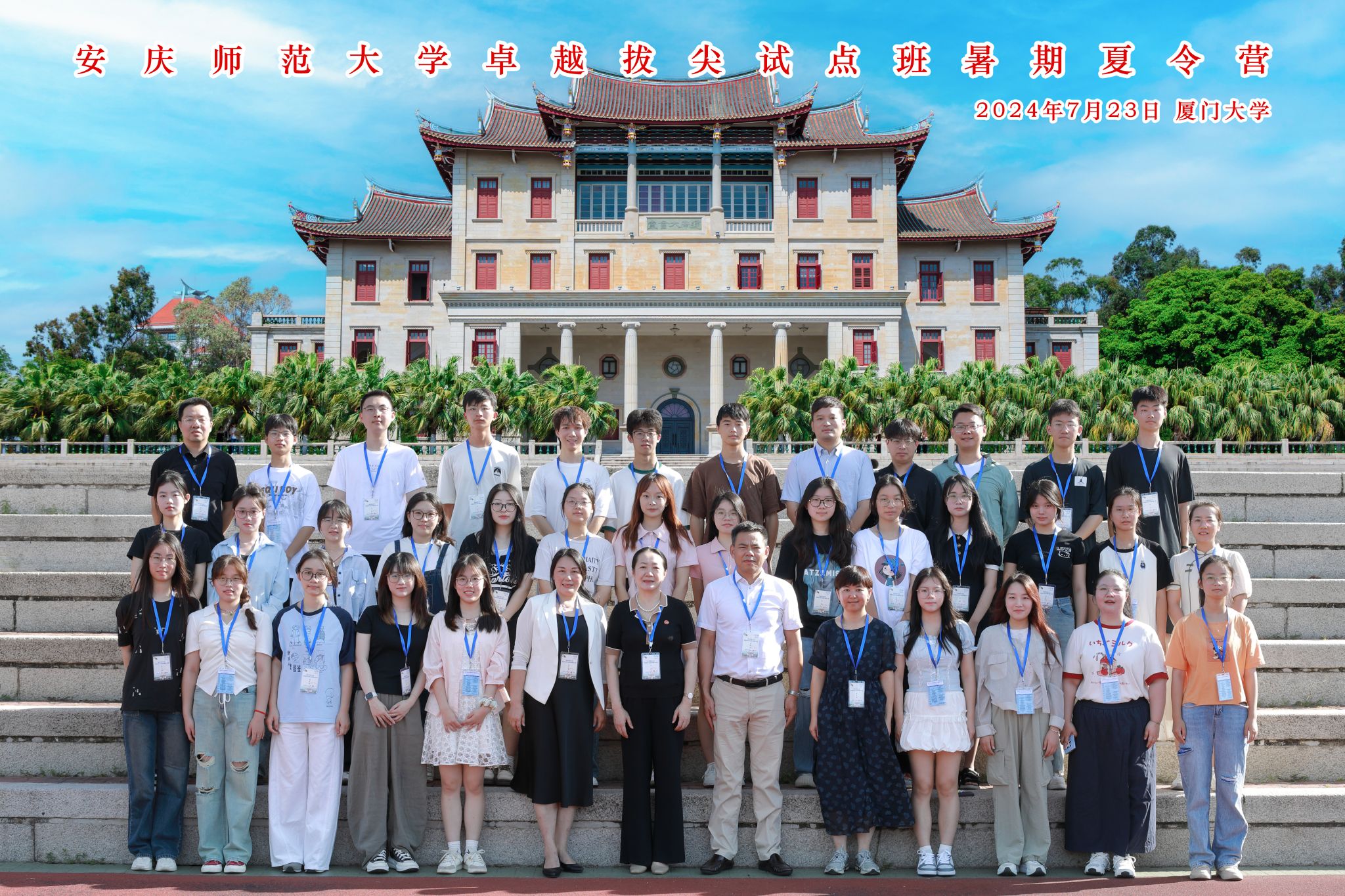 7月23日上午,全体师生在厦门大学建南大会堂前合影,在黄宜弘楼参加了暑期夏令营的开幕仪式,厦门大学朱水涌教授和安庆师范大学党委常委、副董事长吴琼致辞。吴琼副董事长首先对此次暑期夏令营的开展表示热烈祝贺,然后指出学校此次举办卓越拔尖班暑期夏令营的活动意义重大,最后对包括邓稼先班在内的五个拔尖班的全校30名员工予以鼓励并提出要求、寄予厚望。