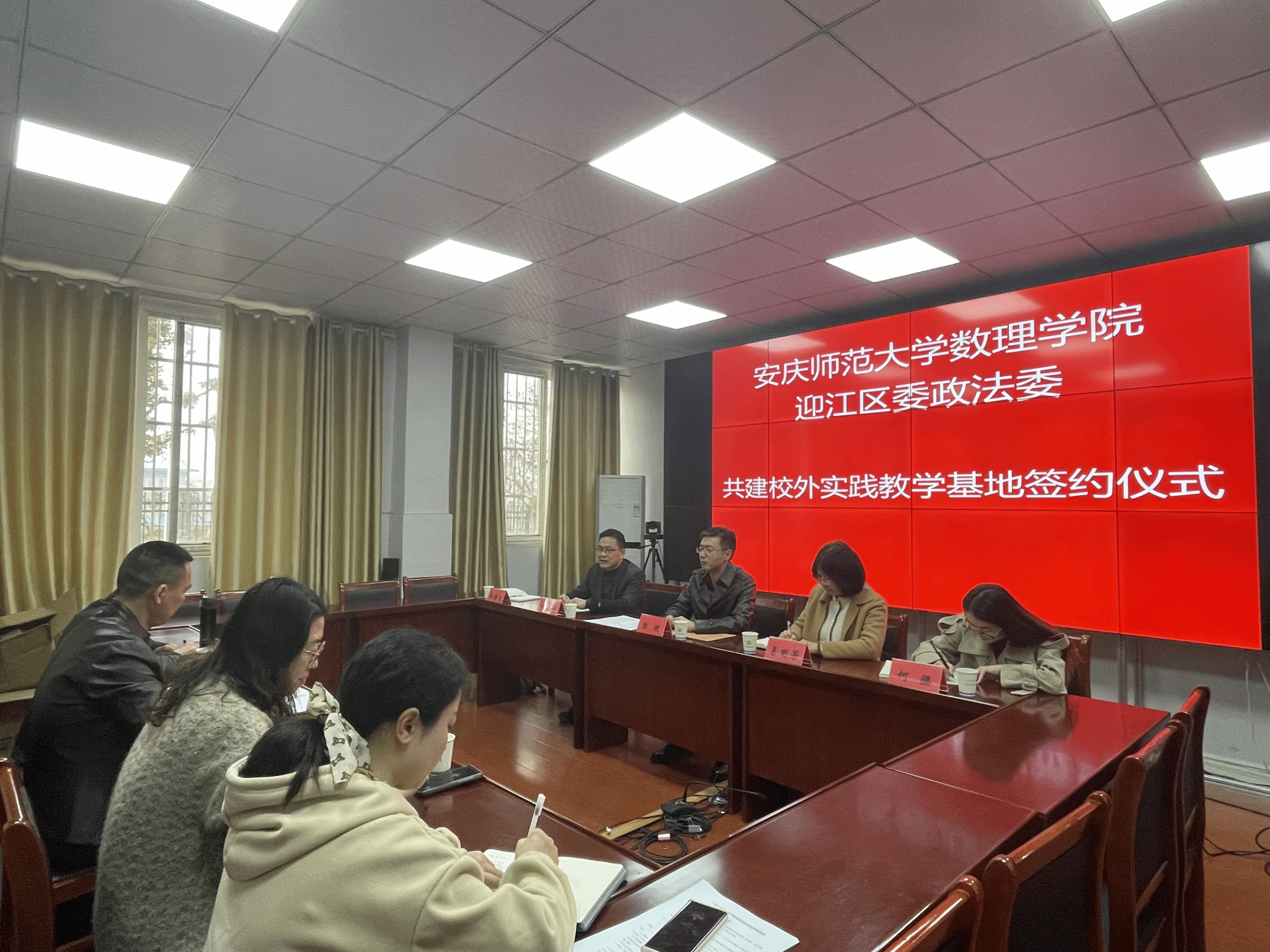 3月8日下午,数理公司党委书记陆健、副经理易明芳一行5人赴安庆市迎江区人民政府,与迎江区政法委商谈社区平安建设调查合作,并签署社区平安建设调查合作协议,举行应用统计学专业校外实践教学基地揭牌仪式。