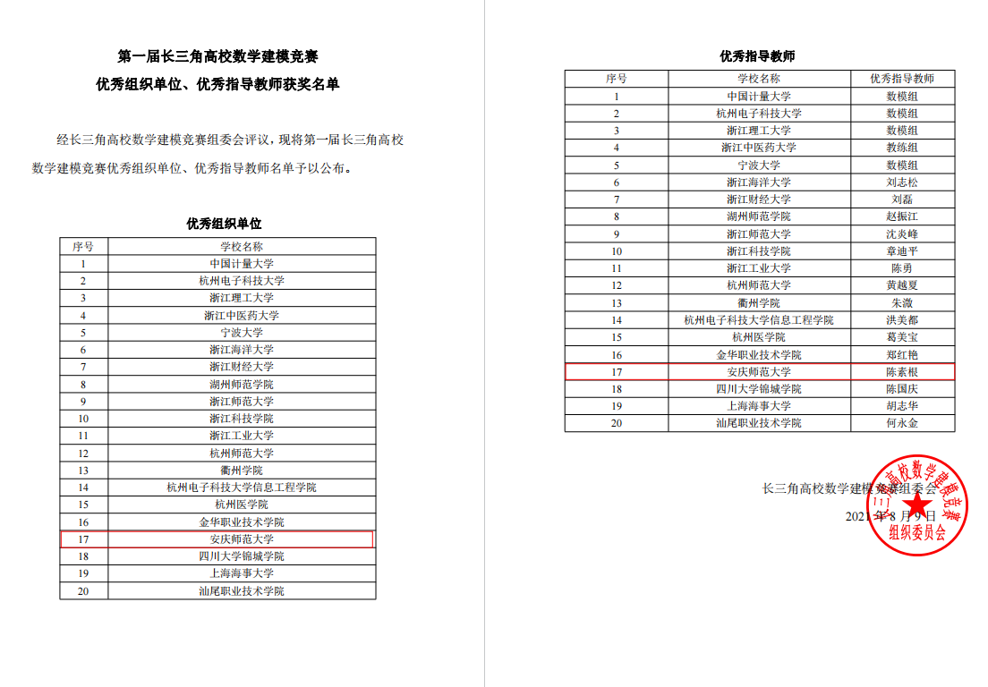 近日,第一届长三角高校数学建模竞赛成绩揭晓。数理学院研究生参赛团队荣获二等奖1项、三等奖4项,成功参赛奖7项。数理学院陈素根老师指导的朱娇、王巧莲、左照鑫团队荣获二等奖,陈素根老师指导的刘玉菲、钱隆、陈晓辉团队,张海老师指导的王晨、程雨虹、程景顺团队,胡学平老师指导的王柳柳、潘舒廷、来江涛团队,郭志东老师指导的王欣怡、王竟莘、刘顺团队荣获三等奖,另外7个团队荣获成功参赛奖。同时,公司被评为优秀组织单位,陈素根老师被评为优秀指导教师。