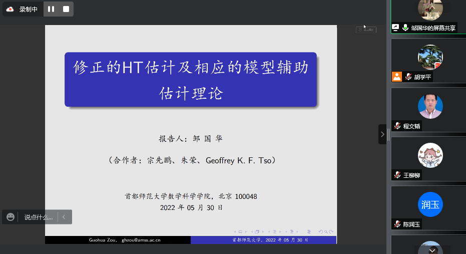 为庆祝安庆师范大学办学125周年,提高师生的科研创新能力,进一步营造良好的学术风气和浓厚的学术氛围,激发师生的科研活力,5月30日晚上,首都师范大学博士生导师邹国华教授应数理学院邀请作了一场题为“Improved Horvitz-Thompson estimator and related theory of model-assisted estimation in survey sampling”的线上学术报告。数理学院特聘教授虞克明教授、统计系教师和统计学硕士点研究生参加了本次报告会,报告会由胡学平教授主持。