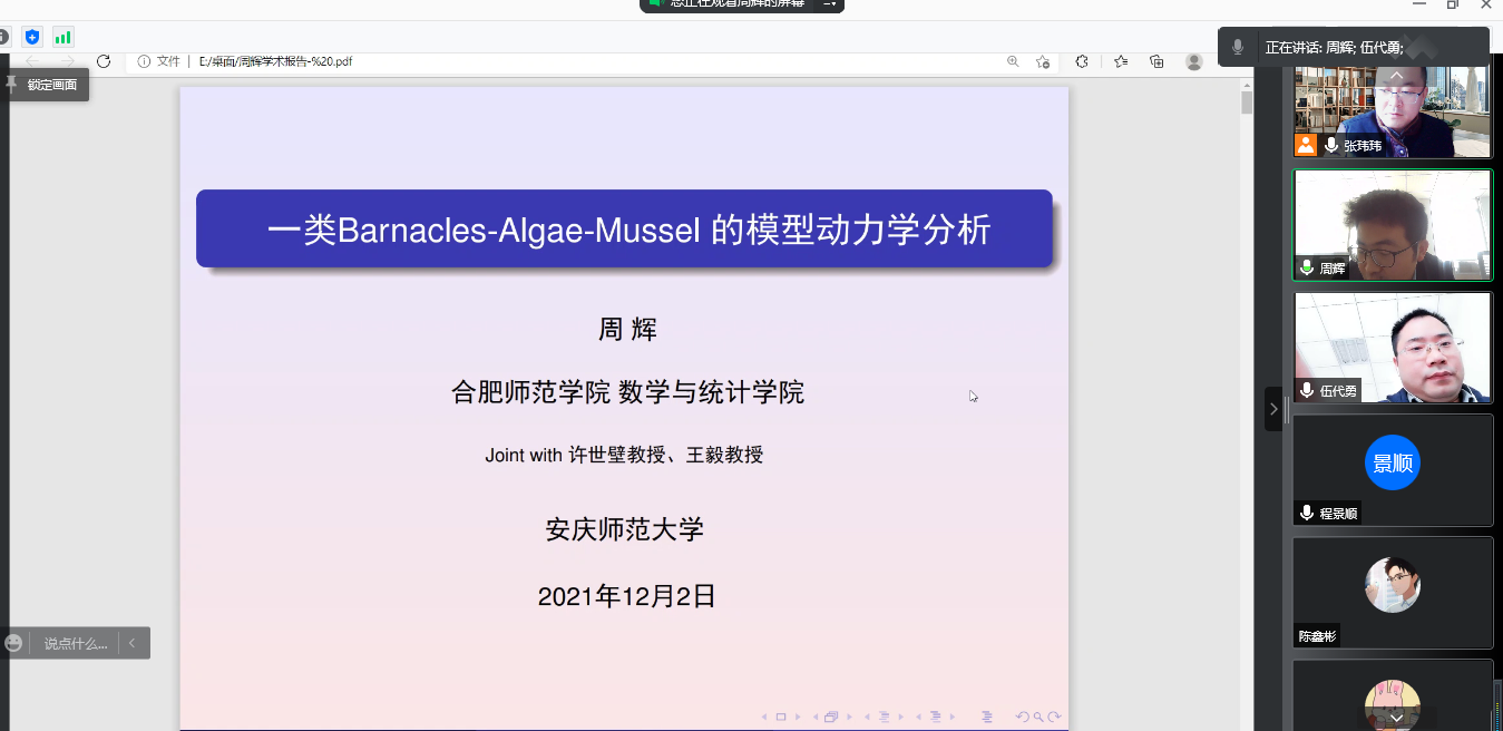 12月2日下午,2009届员工、合肥师范学院数学与统计学院副教授周辉博士应数理学院邀请作了一场题为“一类Barnacle-Algae-Mussel 模型的动力学分析”的线上学术报告。数理学院部分教师、数学一级学科硕士点和统计学一级学科硕士点研究生参加了本次报告会,报告会由数理学院伍代勇教授主持。