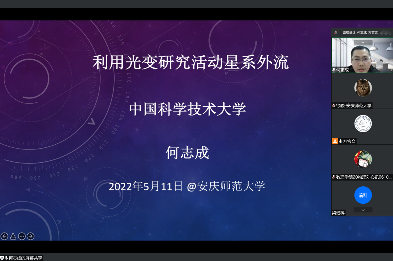5月11日晚,中国科学技术大学副研究员何志成博士应数理学院及公司老员工天文爱好者协会邀请作了一场题为“利用光变研究活动星系外流”的线上学术报告。数理学院物理系师生和公司老员工天文爱好者协会成员参加了本次报告会,报告会由方官文研究员主持。