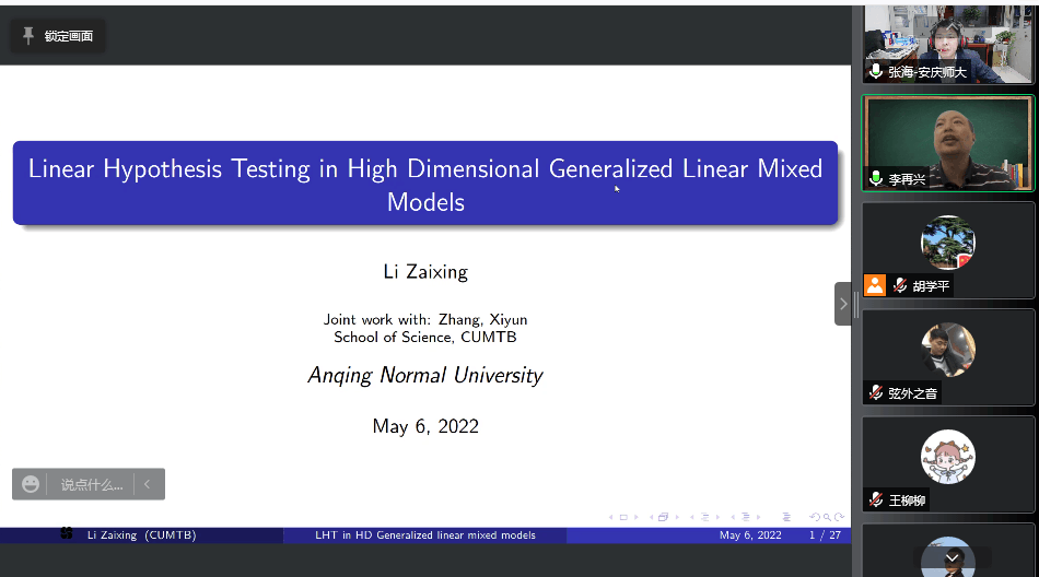 5月6日晚上,2000届员工、中国矿业大学(北京)理学院经理、博士生导师李再兴教授应数理学院邀请作了一场题为“Linear Hypothesis Testing in Ultra High Dimensional Generalized Linear Mixed Models”的线上学术报告。数理学院副经理张海教授、统计学硕士点点长胡学平教授、部分教师和硕士研究生参加了本次报告会,报告会由张海主持。