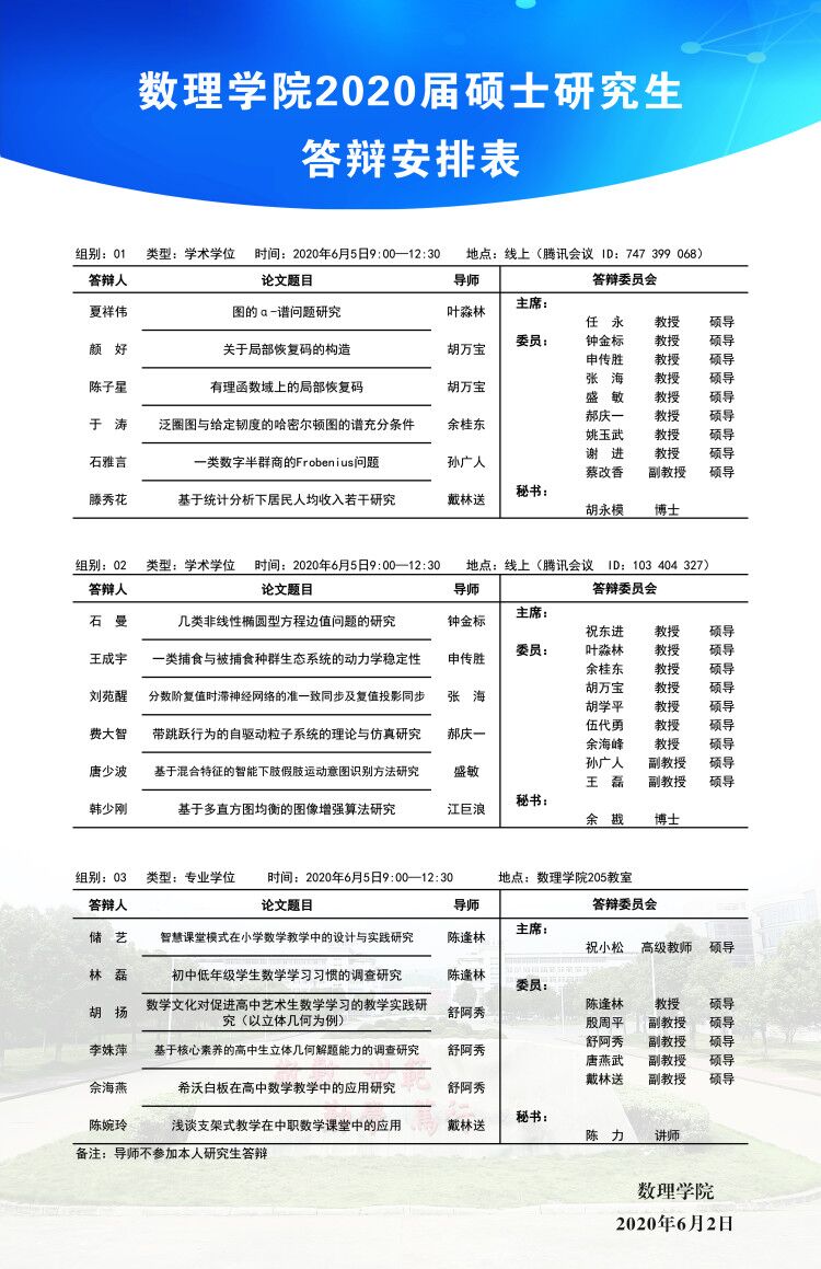 数理学院2020届硕士研究生答辩安排