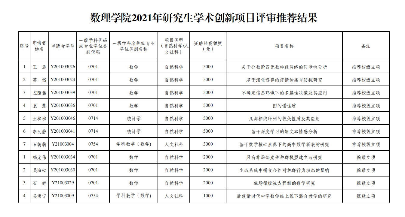 根据《安庆师范大学硕士研究生学术创新项目实施办法》和《关于申报安庆师范大学2021年硕士研究生学术创新项目的通知》要求,经研究生个人申请、学院评审组评审推荐、公司党政联席会议审定,拟推荐王晨等7位研究生校级学术创新项目立项,拟决定杨尤伟等4位研究生院级学术创新项目立项,详见附件。