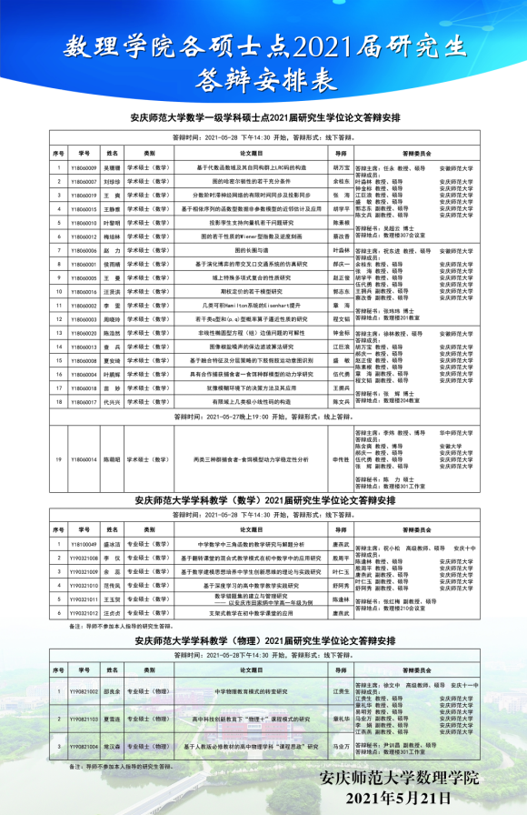 数理学院各硕士点2021届研究生学位论文答辩安排