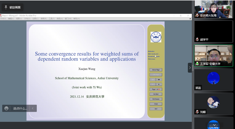 11月14日晚上,安徽大学数学科学学院博士生导师王学军教授应数理学院邀请作了一场题为“Some convergence results for weighted sums of dependent random variables and applications”的线上学术报告。数理学院副经理张海教授、部分教师、数学一级学科硕士点和统计学一级学科硕士点研究生参加了本次报告会,报告会由统计学硕士点点长胡学平教授主持。