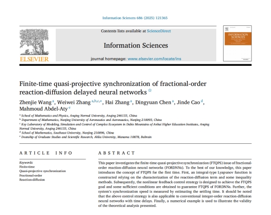 近日,数理学院数学一级学科硕士研究生王振杰以第一作者和导师团队在Elsevier期刊《Information Sciences》发表SCI论文“Finite-time quasi-projective synchronization of fractional-order reaction-diffusion delayed neural networks”,该期刊影响因子IF=8.1,JCR一区期刊,中科院一区TOP期刊。